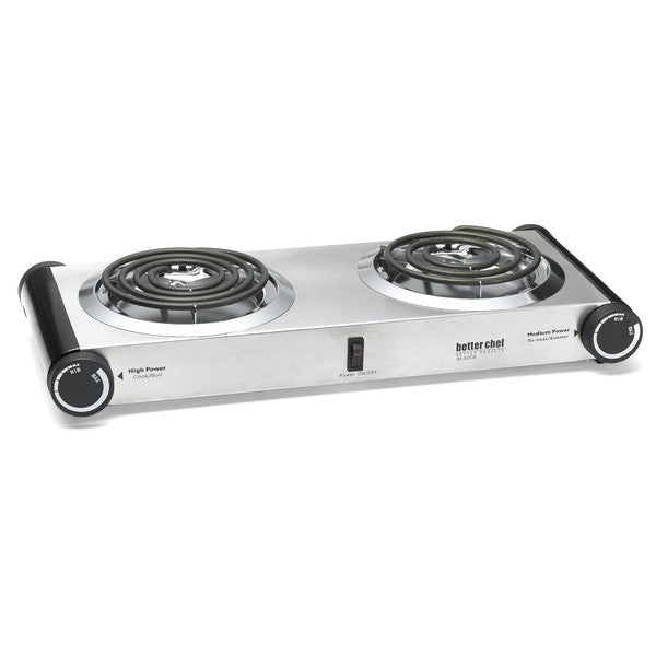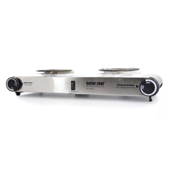 Ever need an extra burner during holiday cooking? Having company and need to keep something warm? Do crafts and not want to mess up your kitchen? The Better Chef Stainless Steel Dual Electric Burner is just the ticket! This dual burner features an adjustable temperature thermostat control to ensure you cook your next great meal at just the right temperature. The beautiful brushed stainless-steel finish will add a sleek look to your countertops.