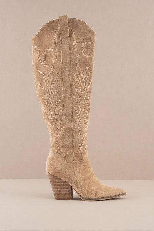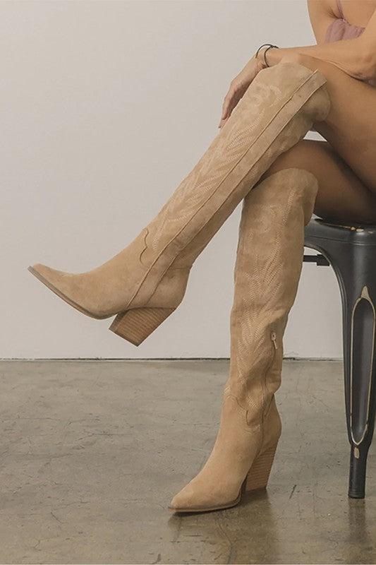 Classic cowboy embroidery on a suede cowboy boot that's been raised to the knees.