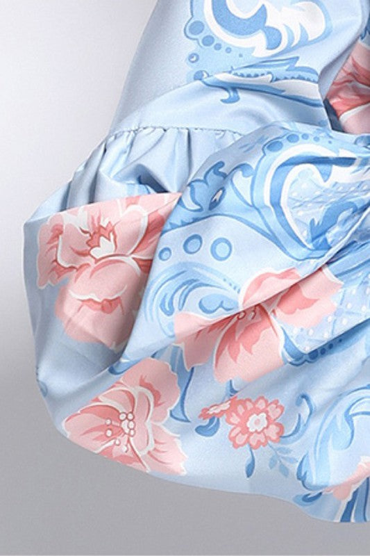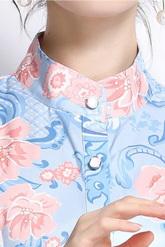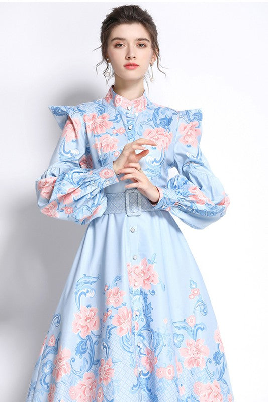 Details-floral multi print, front button, long sleeves, A-line style skirt with a belt look,side zipper