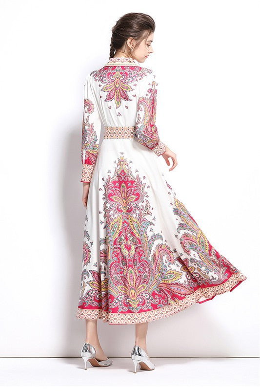 Details-floral multi print, front button, long sleeves, A-line style skirt with a belt look ,side zipper