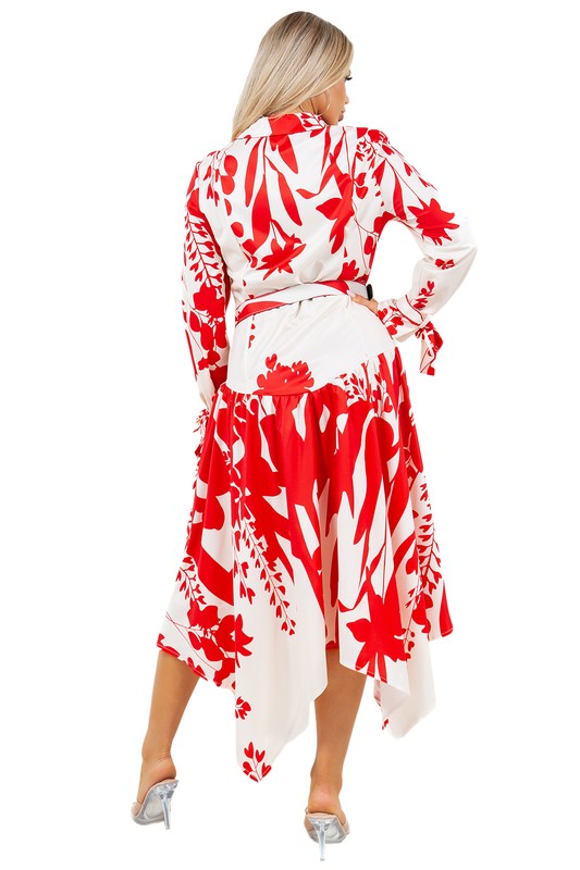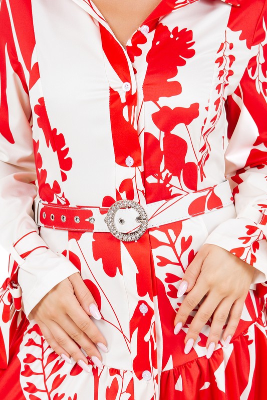 Sexy maxi dress, Front button closure, Attached waist tie Spread collar, Long sleeves attached strap bow-tie look